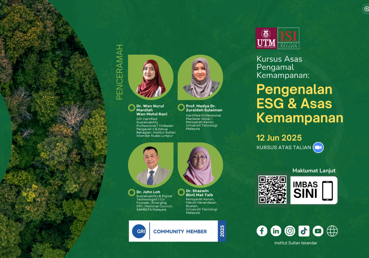 Besides that, UTM also organised an UTM-linked online course, Kursus Asas Pengamal Kemampanan: Pengenalan ESG & Asas Kemampanan, held on 12 June 2025, covering introductory ESG and sustainability concepts. The materials indicate UTM involvement through Institut Sultan Iskandar and university-affiliated speakers, supporting the presence of structured environmental sustainability training content for participants. In addition, other sustainability knowledge-sharing activities led by UTM staff, including a session titled “Why Sustainability Matters in Our Organization?” delivered during Malaysia Marine & Heavy Engineering HSE & Sustainability Week on 15 August 2025, with 300+ participants engaged around sustainability culture, environmental progress, and organisational action. These reflect UTM’s role in delivering environmental sustainability education and professional awareness activities.