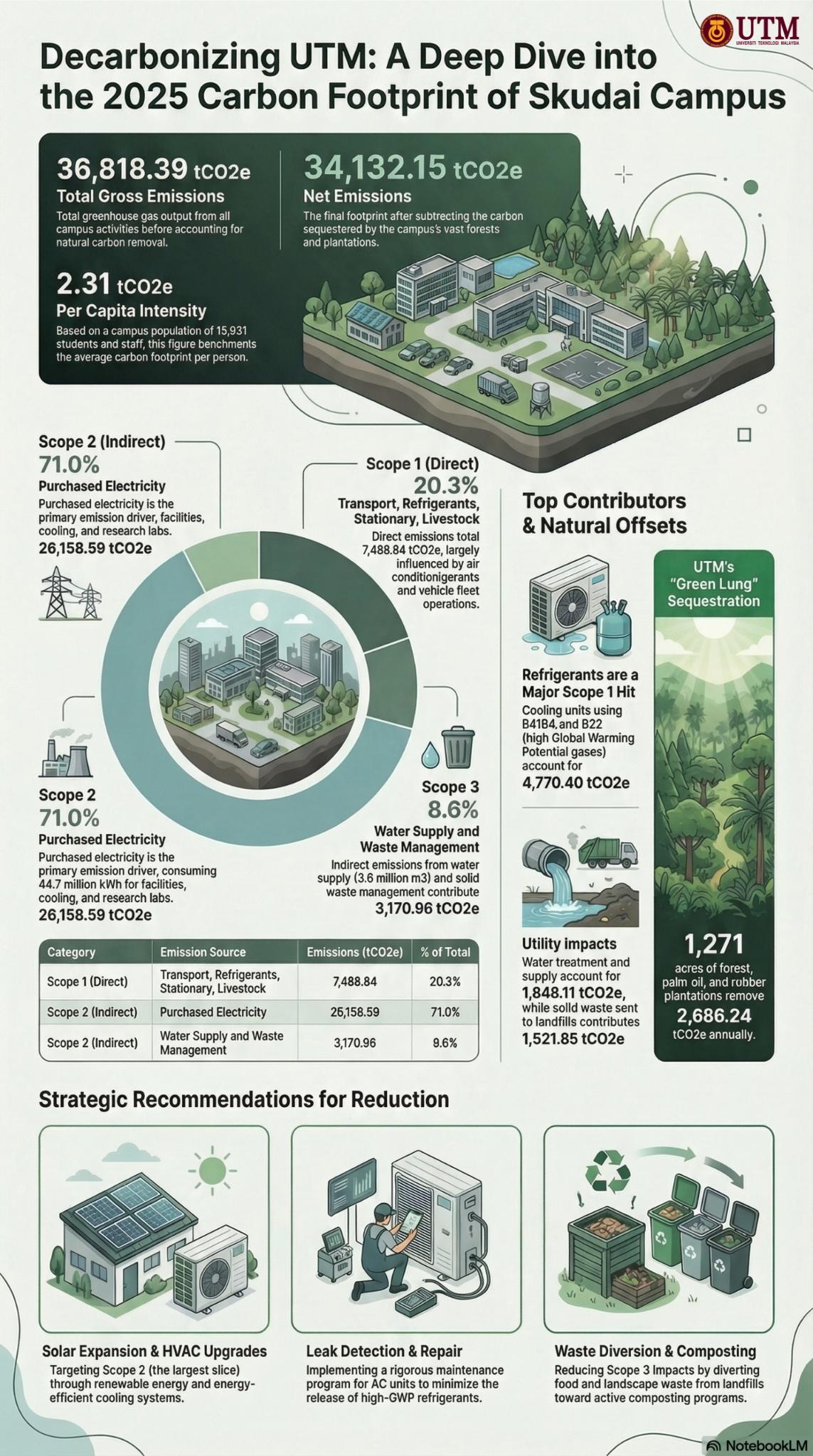 Crucially, the Skudai Campus benefits significantly from its natural "Green Lung." Spanning 1,271 acres, the campus’s dedicated forest, palm oil, and rubber plantations act as a vital carbon sink, successfully sequestering 2,686.24 tCO₂e annually. Factoring in this natural offset, UTM's net emissions are reduced to 34,132.15 tCO₂e, highlighting the immense value of integrating natural landscapes into institutional infrastructure.